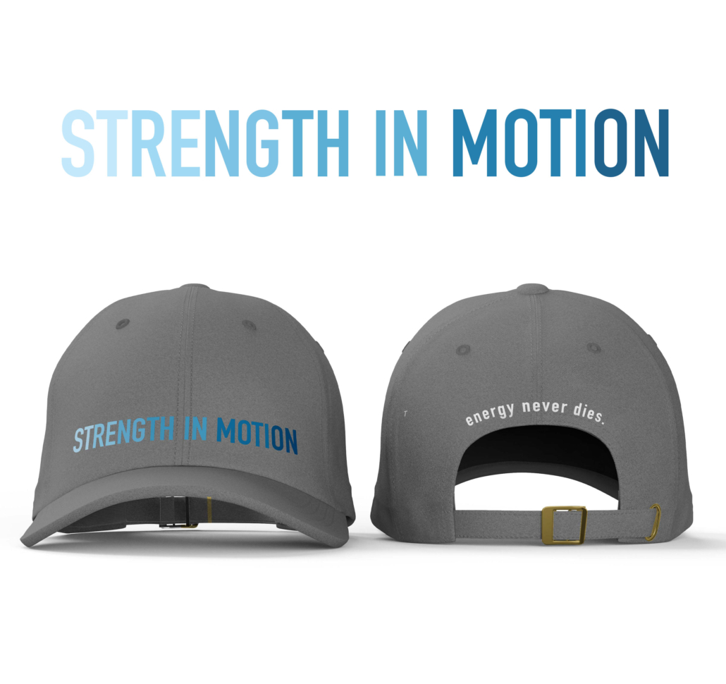 - Steel grey colorway with gradient “Strength in Motion” lettering